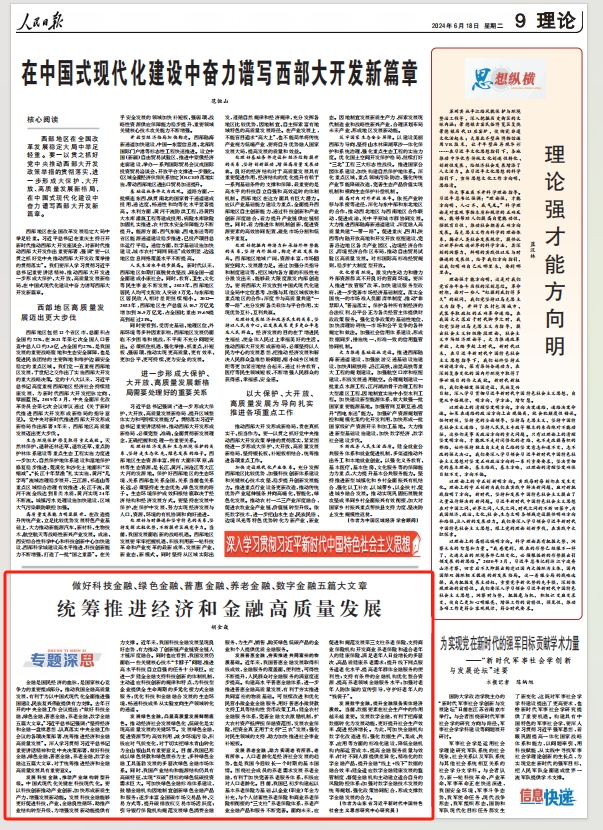 新聞網訊 6月18日,《人民日報》刊登我校黨委書記胡金焱的理論研究文章“做好科技金融、綠色金融、普惠金融、養老金融、數字金融五篇大文章,統籌推進經濟和金融高質量發展(專題深思)”。