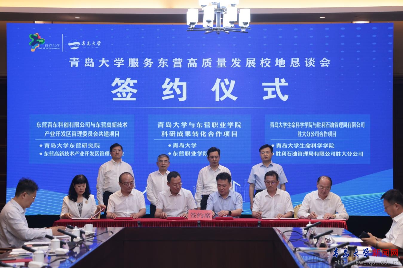 在胡金焱、魏志強(qiáng)、陳必昌、何憲卓見證下,雙方舉行了“共建青島大學(xué)科創(chuàng)中心及孵化基地項(xiàng)目”、“青島大學(xué)與勝大集團(tuán)合作協(xié)議”、“東營青東科創(chuàng)有限公司與東營高新技術(shù)產(chǎn)業(yè)開發(fā)區(qū)管理委員會(huì)共建青島大學(xué)東營研究院合作協(xié)議”、“青島大學(xué)與東營職業(yè)學(xué)院科研成果轉(zhuǎn)化合作協(xié)議”、“青島大學(xué)生命科學(xué)學(xué)院與勝利石油管理局有限公司勝大分公司合作協(xié)議”等項(xiàng)目和協(xié)議的簽署。