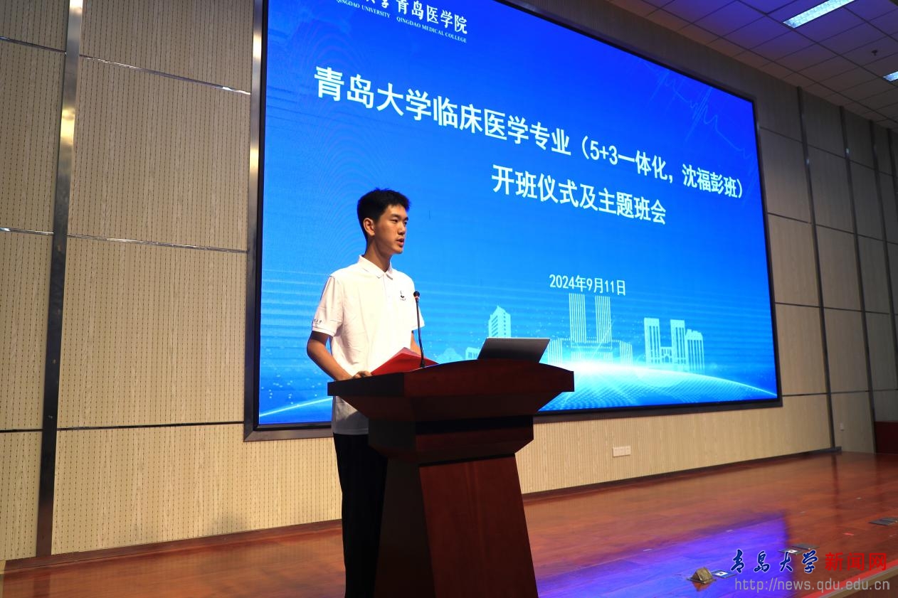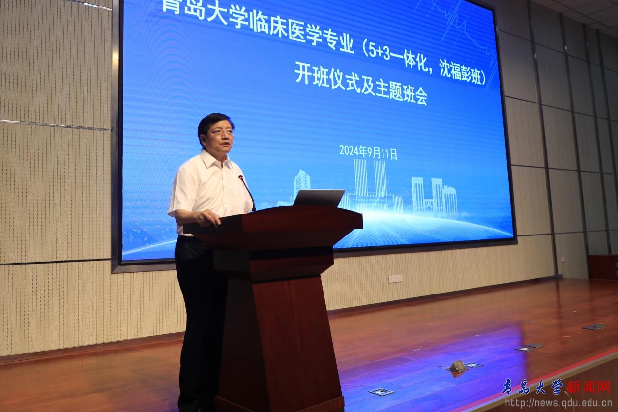 新聞網訊 9月11日上午,臨床醫學專業沈福彭班(5+3一體化)開班儀式暨“仁心至善 ‘醫’路生花”主題班會在浩園醫學教育綜合樓學術報告廳舉行。校長魏志強,副校長李建波,醫學部黨委書記、附屬醫院黨委書記蔣光峰,沈福彭教授之女沈華女士出席會議,黨委宣傳部、教務處、研究生處、學生工作處相關負責人和醫學部有關黨政領導、教師代表、臨床醫學專業沈福彭班(5+3一體化)2024級全體同學參加班會。