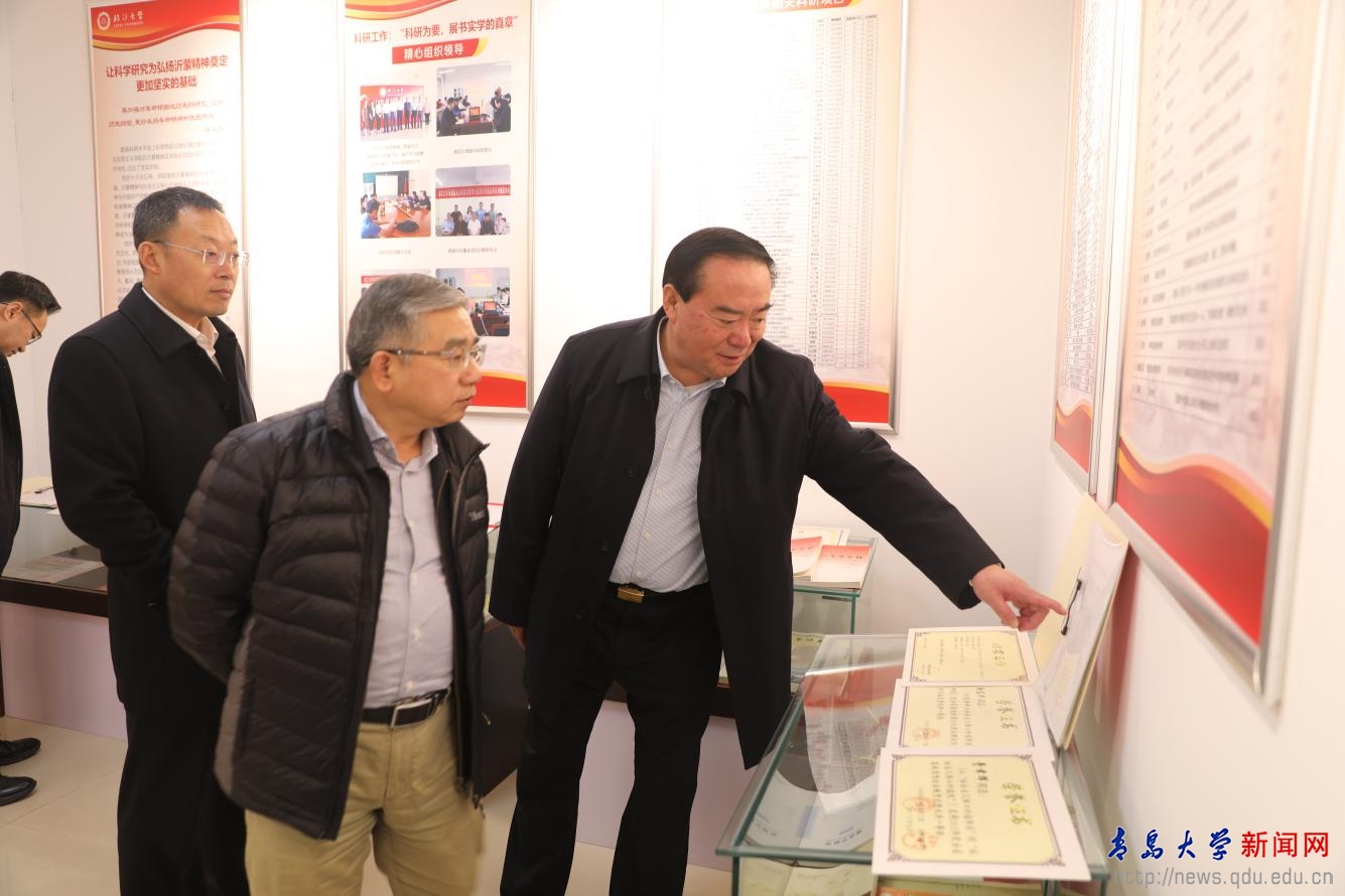 在臨沂大學黨委書記王煥良陪同下,胡金焱一行分別參觀了國家革命文物協同研究中心、沂蒙精神研究成果展,再生醫學創新研究院和鑫海新能源材料研究院。