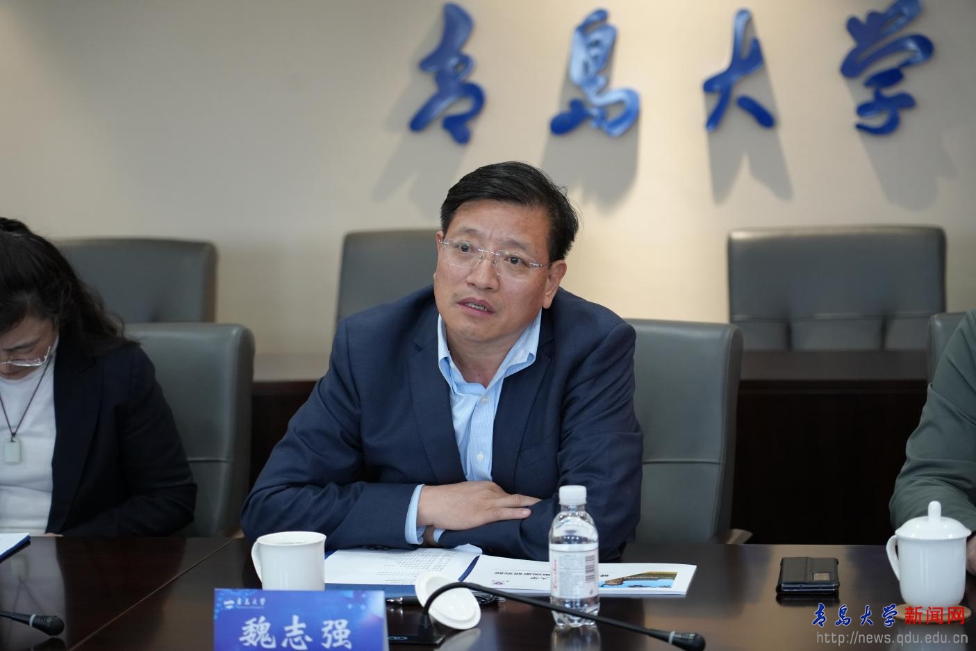 魏志強與南京大學客人進行了座談交流。魏志強重點向客人介紹了青島大學的學科特色和發展方向。他表示,學校突出“醫工交叉、特色鮮明,文理支撐、綜合厚重”,著力打造特色顯著、國際知名、國內一流的高水平綜合性研究型大學。魏志強指出,在醫工交叉方面,學校整合優勢學科,系統性推進智慧醫療建設,全力構建醫工交叉產學研發展體系。他希望同南京大學在該領域廣泛開展合作,充分發揮雙方的優勢學科和技術資源,推進跨區域交流、跨學科交叉,并鼓勵學校各相關單位和各附屬醫院積極參與校際合作項目,統籌項目規劃、做好項目對接、搭建合作平臺,集中力量產出大成果。
