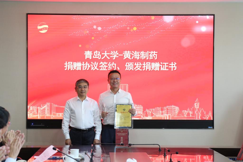 儀式上,胡金焱為劉鳳杰頒發了捐贈證書和捐贈紀念物。胡金焱和王澤楷共同為“青島大學-黃海制藥本科實習教學基地協議”、“青島大學-黃海制藥研究生聯合培養基地”揭牌。