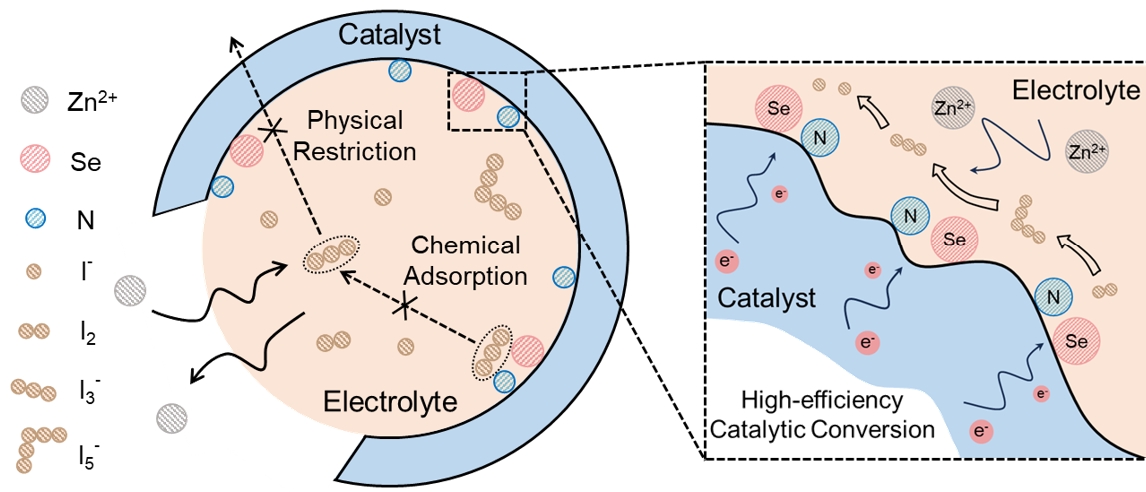 由于鋅-碘電池具有理想的能量密度(理論上為272 Wh kg-1)、安全和環(huán)境友好性的優(yōu)勢(shì),引起了廣大的關(guān)注。然而,親水性多碘化物中間體(I5-和I3-)在電極上的穿梭,和緩慢的碘轉(zhuǎn)化動(dòng)力學(xué)嚴(yán)重影響了電池的實(shí)際性能。本文通過將原子級(jí)分散的半金屬硒單原子(Se SAs)包埋在ZIF-8衍生的氮摻雜碳中,成功設(shè)計(jì)了具有雙活性位點(diǎn)的高效碘宿主。這種設(shè)計(jì)觸發(fā)了碘的快速轉(zhuǎn)化,而且增強(qiáng)了多碘化物的錨定,抑制了I3-穿梭,實(shí)現(xiàn)了優(yōu)異的倍率性能和循環(huán)壽命。原位表征和計(jì)算結(jié)果表明,除了多孔碳骨架的物理約束和增強(qiáng)的化學(xué)吸附外,碳上的Se SAs位點(diǎn)和N位點(diǎn)通過調(diào)制轉(zhuǎn)化反應(yīng)能壘實(shí)現(xiàn)了快速的 I0/I-偶聯(lián)轉(zhuǎn)化反應(yīng)。這項(xiàng)工作為設(shè)計(jì)下一代水系鋅-碘電池的高效I2宿主提供了有價(jià)值的見解。