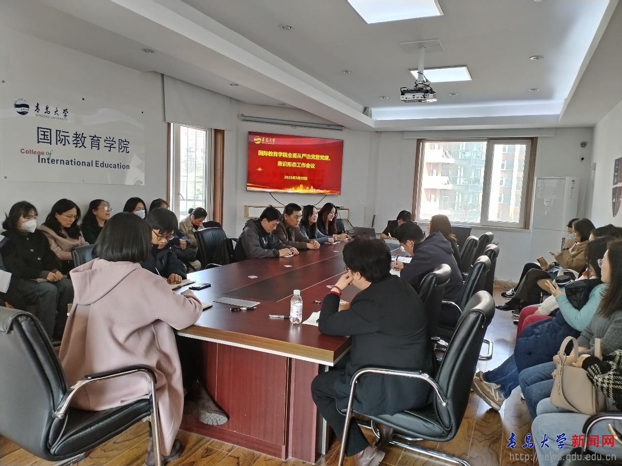 紀皓瑛傳達了學校全面從嚴治黨暨黨的建設工作領導小組(擴大)會議精神,對國際教育學院2025年全面從嚴治黨工作和意識形態工作進行了部署。