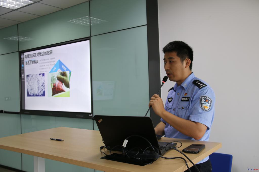 啟動儀式結束后,嶗山區公安分局禁毒大隊韓玉龍為學生禁毒宣傳志愿者做了《嶗山區禁毒形勢及青少年預防教育》的專題培訓講座。