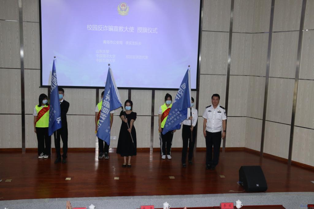 啟動儀式上,青島市公安局領導和青島市委教育工委(青島市教育局)領導分別為青島高校“校園反詐騙宣教大使”、“金蜜蜂金融知識宣教大使”宣講團學生代表授旗,學生志愿服務宣教團將深入學生課堂、班級、宿舍開展相關防范電信網絡詐騙主題活動。