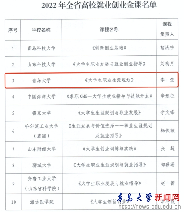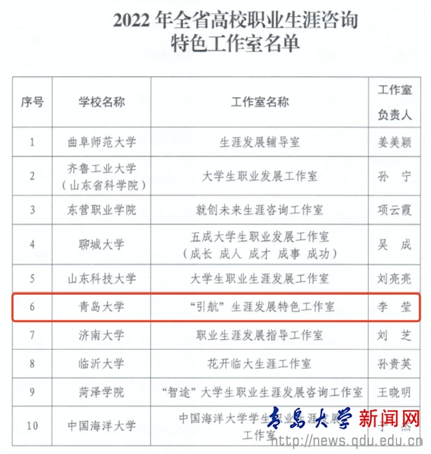 新聞網訊 近日,山東省人力資源和社會保障廳發布《關于公布2022年全省高校就業創業金課和職業生涯咨詢特色工作室的通知》,我校學生工作處負責老師李瑩的《大學生職業生涯規劃》課程獲評山東省高校就業創業金課,并被推薦參評教育部全國高校就業創業金課評選,“引航”職業生涯咨詢工作室獲評山東省高校職業生涯咨詢特色工作室。