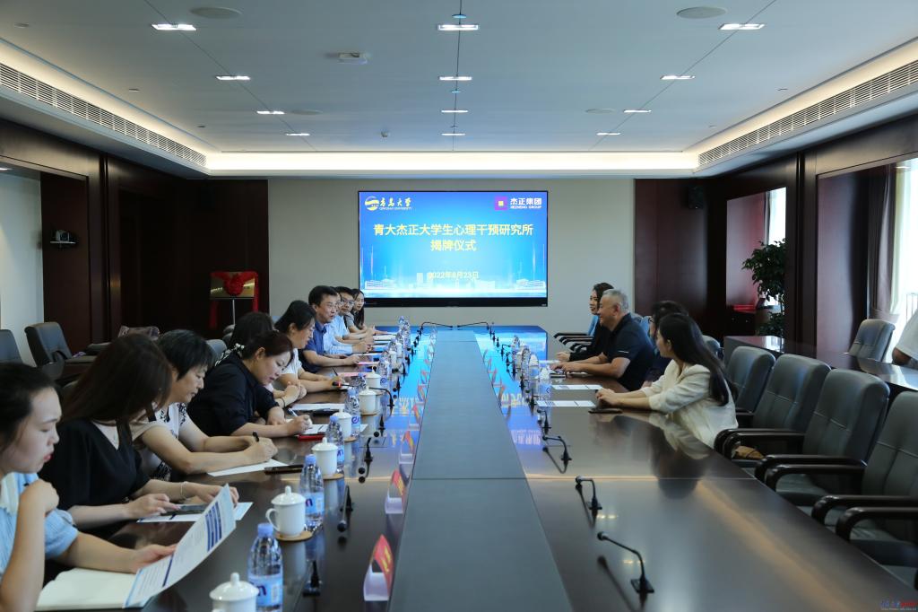 新聞網訊 8月23日上午,青大杰正大學生心理干預研究所揭牌儀式在會議中心302舉行。杰正投資集團有限公司董事長方海暉,校黨委常委、副校長劉彩云出席儀式。杰正投資集團有限公司,青島大學學生工作處、合作發展處、財務處等部門負責人及相關人員參加揭牌儀式。