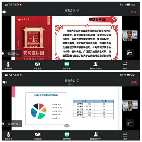 自9月6日起,“新生安全教育、共赴使命擔(dān)當(dāng)”系列宣講及交流會以云直播方式面向全體新生順利開展。宣講團(tuán)成員圍繞新生的學(xué)習(xí)生活特點,結(jié)合近年來高校典型案例,將多種詐騙方式進(jìn)行分析,向同學(xué)們詳細(xì)介紹了各類電信網(wǎng)絡(luò)詐騙的手段、方法以及防范要點,并演示指導(dǎo)同學(xué)們下載具有詐騙預(yù)警和反詐知識宣傳功能的國家反詐中心app。宣講中還結(jié)合《純凈校園、無毒最美》、《戰(zhàn)疫之中學(xué)防護(hù),時代青年勇?lián)?dāng)》、《文明上網(wǎng)由我先行,攜手共書文明校園》、《校園反詐不能停,你我一道筑盾牌》等板塊內(nèi)容,講解了新生們在疫情之下如何擔(dān)當(dāng)時代責(zé)任,以實際行動積極學(xué)習(xí)安全知識,牢固樹立安全意識,和應(yīng)對各類侵害的能力,給新生安全教育打了一劑“加強(qiáng)針”。